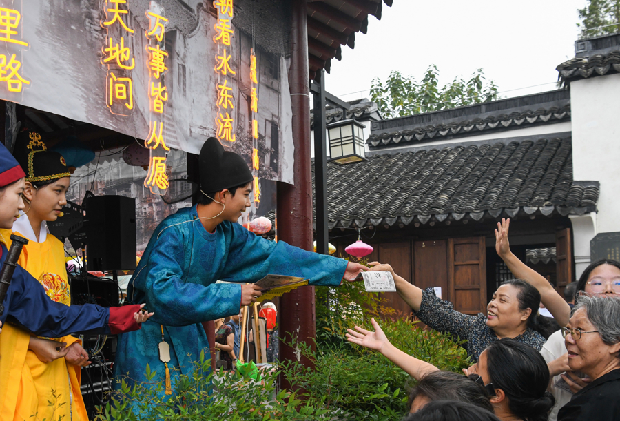 首日最受欢迎的体验项目,当数《仓城四代记·松江商脉》实景剧本游,全天参与人数超3000人次。剧本游以仓城明、清、民国、现代四代历史为脉络,覆盖陆氏宅、杜氏雕花楼、江南曲圣纪念馆、欢喜小院等20余处实景场景。参与者抽取不同的角色后,可完成“核粮囤数目”“寻昆曲唱本”“筹备民国婚礼”等任务——孩子跟着NPC学船拳赢“仓城通宝”,老人在仓城拾光馆辨认老粮票、旧账本唤醒乡愁,不少家庭祖孙三代共同参与,在互动中读懂漕运故事。